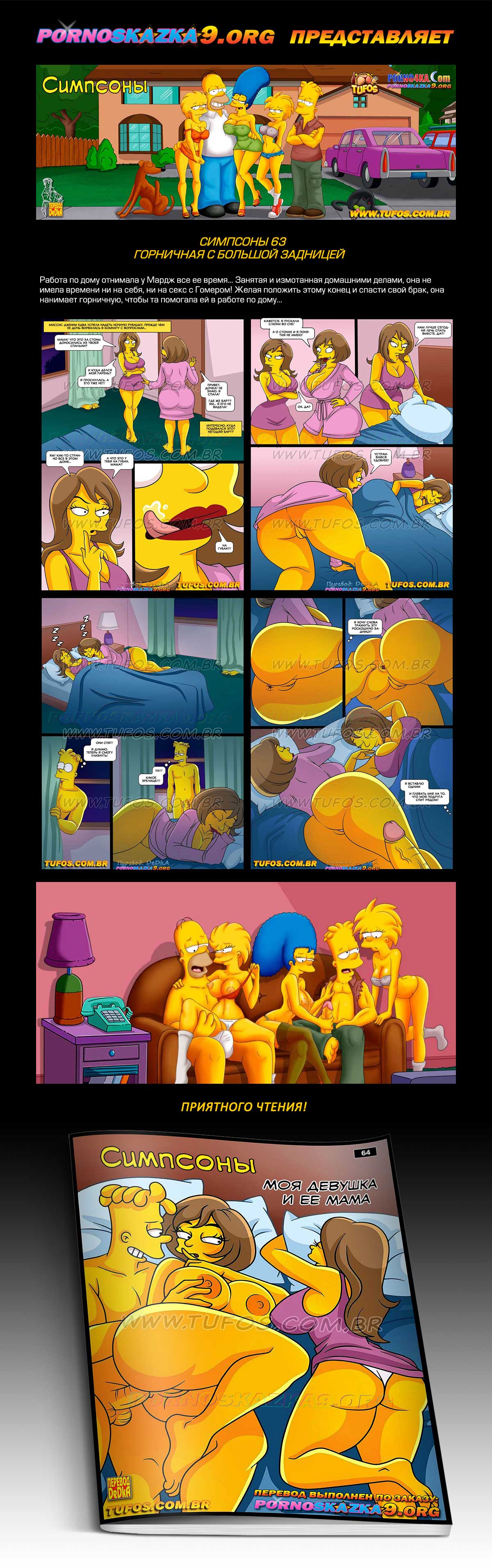 Порно комикс «Симпсоны. Часть 64. Моя девушка и ее мама.» Миссис Дженни едва успела надеть ночную рубашку, прежде чем ее дочь ворвалась в ее спальню с вопросами… Дженнифер спрашивает у матери, куда подевался ее парень, и что это за стоны раздавались из ее спальни! Миссис Дженни делает вид, что ничего не знает, и они ложатся спать вместе… В этот момент из-за занавески выходит прятавшийся там Барт…